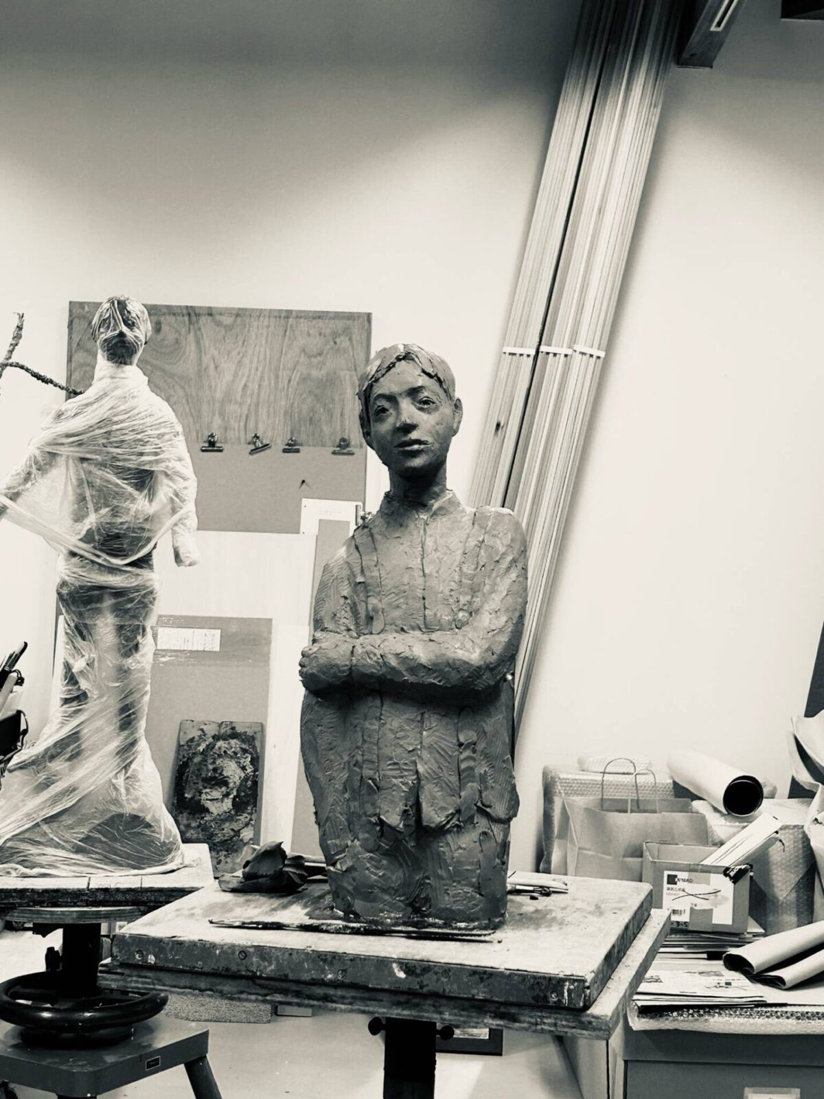 生井さんの乾漆技法を用いた彫刻は、土、石膏、漆、麻を素材に、モデルを含む対象とのやり取りを重ねるなかでひとつの像に納められます。