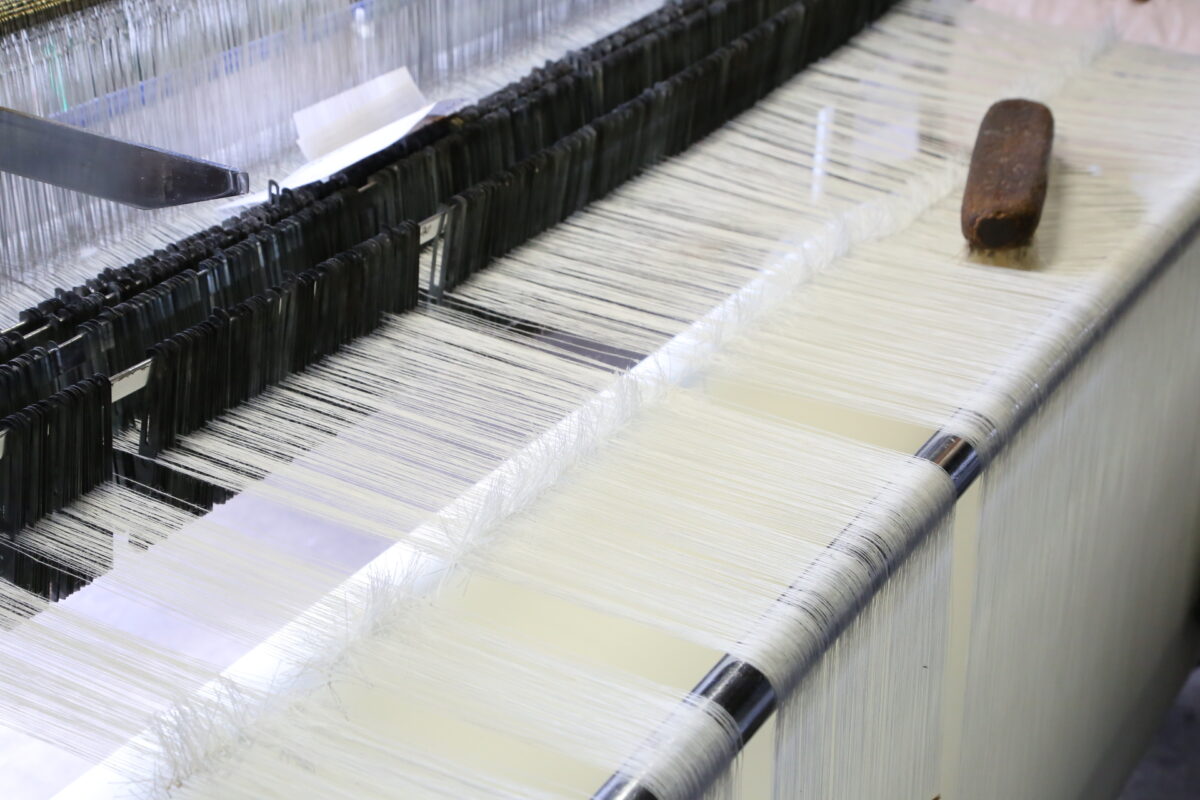 遠州織物は、海外のメゾン系ブランドなどで多く使われている、いわゆる高級生地で、細番手の糸で高密度の生地を織る技術が受け継がれています。