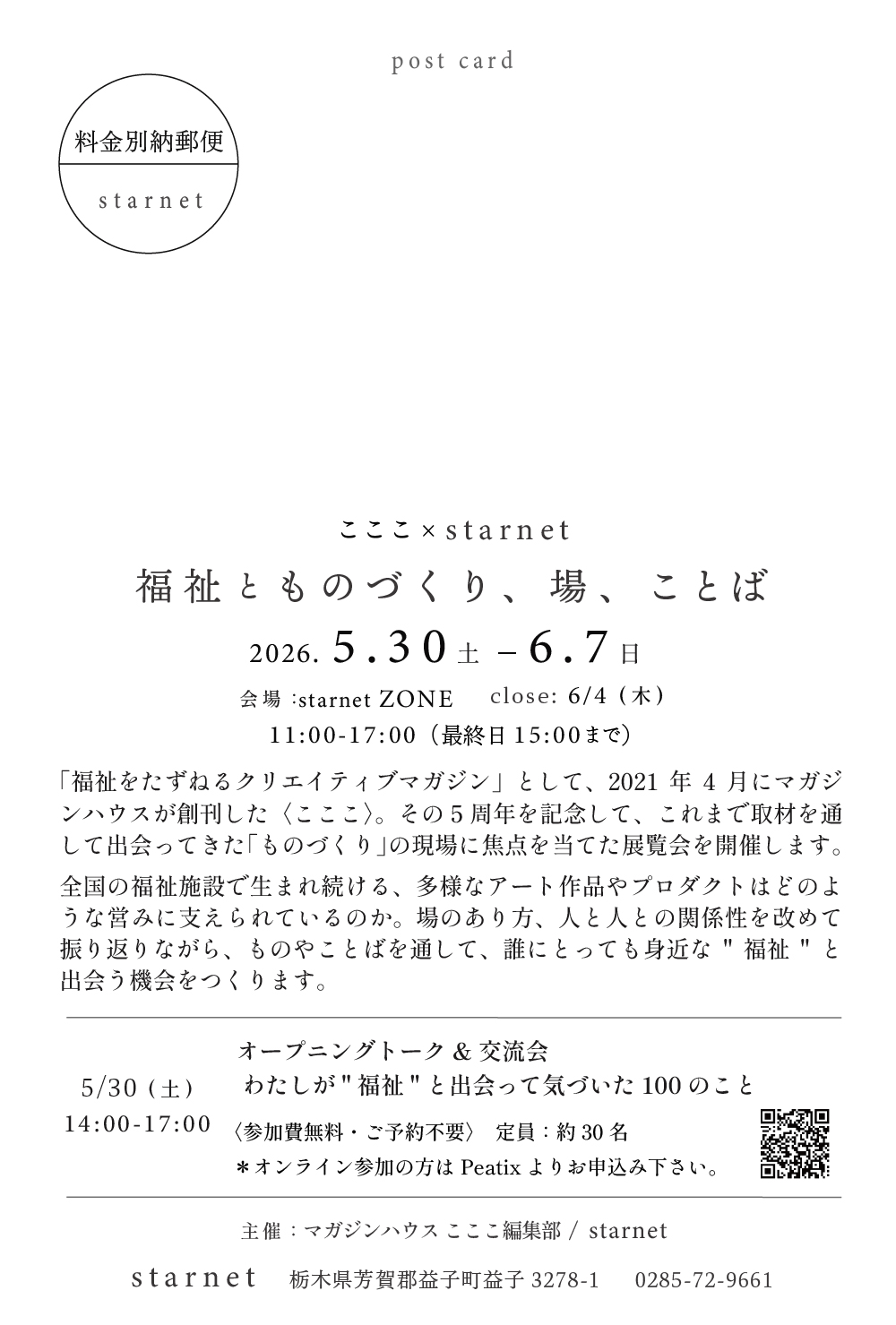 企画展|「福祉とものづくり、場、ことば」こここ×starnet 2026.5.30-6.7
